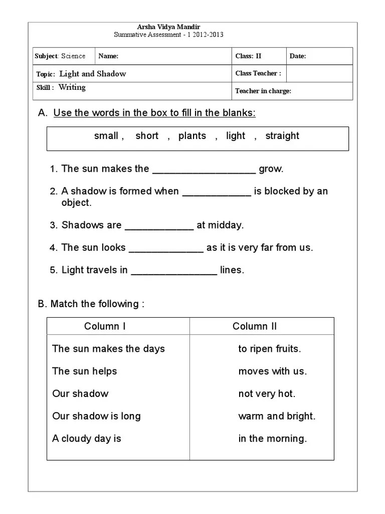 Light And Shadow Worksheet For Grade 1 - Free Worksheets For Cbse Grade 2 -. 3) now, you can ask children some. Light online worksheet for grade 6. How light is studied in primary school: Light and shadow worksheet 1 . Students will look at how the ideas of light and shadow are connected in the real.